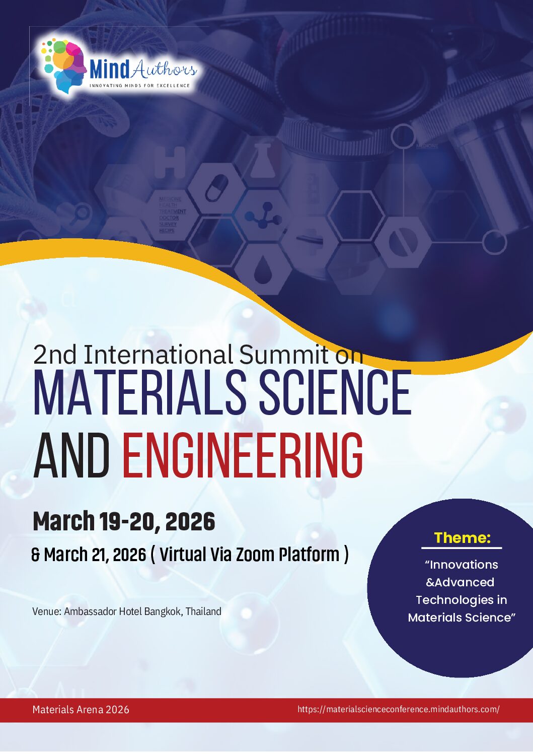 2nd International summit on Materials Science and Engineering which is scheduled to be held from March 19, 20, and March 21, 2026, in Bangkok, Thailand. Materials Arena 2026 will create a global platform for researchers, scientists, academicians, policymakers, and industry experts to share experiences, discuss research findings, and acquire the desired knowledge in the subject from around the world with many networking opportunities. The Materials Arena 2026 International Conference is a federated organization dedicated to bringing together a significant number of diverse scholarly events for presentation within the conference program. Events will run over some time during the conference depending on the number and length of the presentations. With its high quality, it provides exceptional value for students, academics, and industry researchers. International Conference on Material Science and Engineering aims to bring together leading academic scientists, researchers, and research scholars to exchange and share their experiences and research results on all aspects of Material Science and engineering. It also provides a premier interdisciplinary platform for researchers, practitioners, and educators to present and discuss the most recent innovations, trends, and concerns as well as practical challenges encountered and solutions adopted in the fields of Material Science & Engineering.